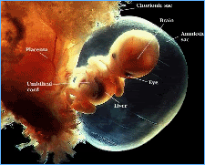 Het kleine mensje wordt beschermd door de baarmoederzak, gevuld met vloeistof.